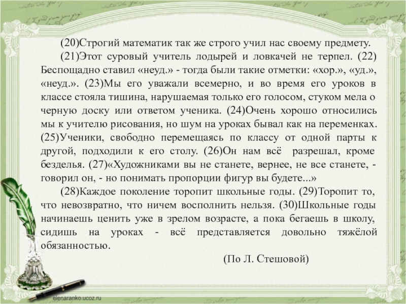учитель лодырей и ловкачей не терпел. (22)Беспощадно ставил «неуд.» - тогда были такие отметки: «хор.», «уд.», «неуд.». (23)Мы его уважали всемерно, и во время его уроков в классе стояла тишина, нарушаемая только его голосом, стуком мела о черную доску или ответом ученика. (24)Очень хорошо относились мы к учителю рисования, но шум на уроках бывал как на переменках. (25)Ученики, свободно перемещаясь по классу от одной парты к другой, подходили к его столу. (26)Он нам всё разрешал, кроме безделья. (27)«Художниками вы не станете, вернее, не все станете, - говорил он, - но понимать пропорции фигур вы будете...»