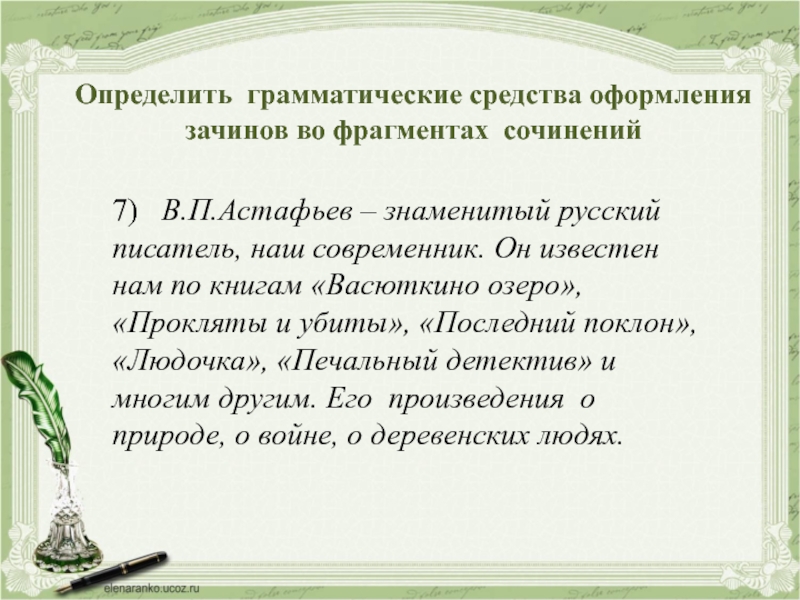 Слайд 11Определить грамматические средства оформления зачинов во фрагментах сочинений