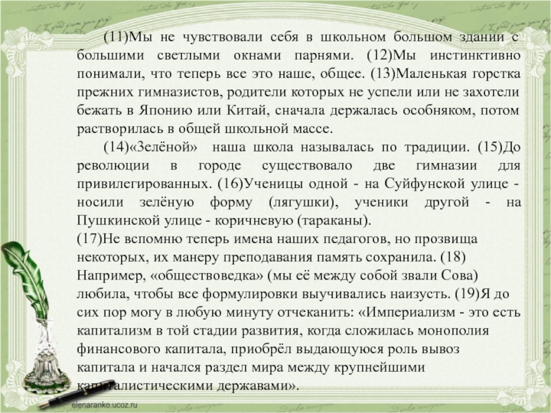 (14)«3елёной» наша школа называлась по традиции. (15)До революции в городе существовало две гимназии для привилегированных. (16)Ученицы одной - на Суйфунской улице - носили зелёную форму (лягушки), ученики другой - на Пушкинской улице - коричневую (тараканы).