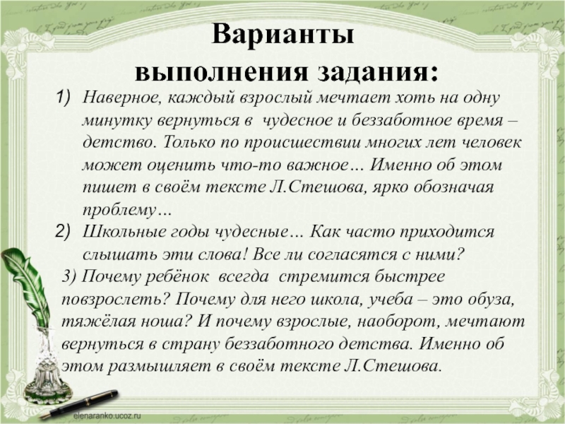 3) Почему ребёнок всегда стремится быстрее повзрослеть? Почему для него школа, учеба – это обуза, тяжёлая ноша? И почему взрослые, наоборот, мечтают вернуться в страну беззаботного детства. Именно об этом размышляет в своём тексте Л.Стешова.