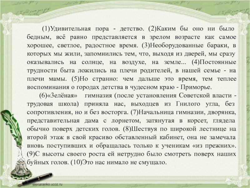 Слайд 18 (1)Удивительная пора - детство. (2)Каким бы оно ни было бедным,