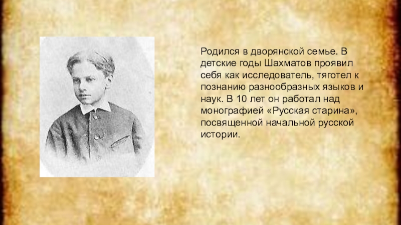 Слайд 2Родился в дворянской семье. В детские годы Шахматов проявил себя как