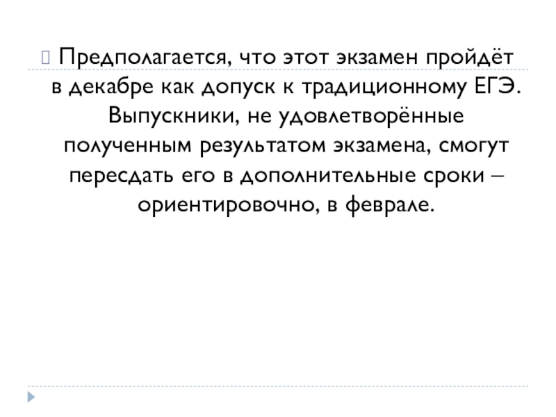 Слайд 3Предполагается, что этот экзамен пройдёт в декабре как допуск к традиционному
