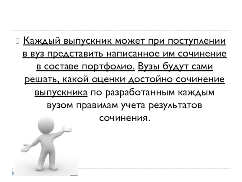 Слайд 4Каждый выпускник может при поступлении в вуз представить написанное им сочинение