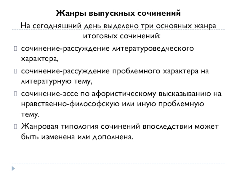 На сегодняшний день выделено три основных жанра итоговых сочинений: