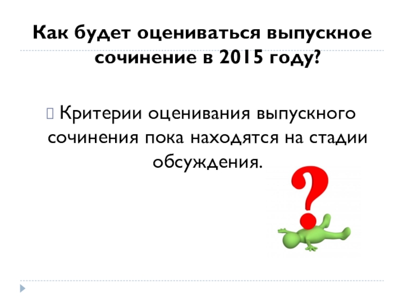 Как будет оцениваться выпускное сочинение в 2015 году?Критерии оценивания выпускного сочинения пока находятся на стадии обсуждения.