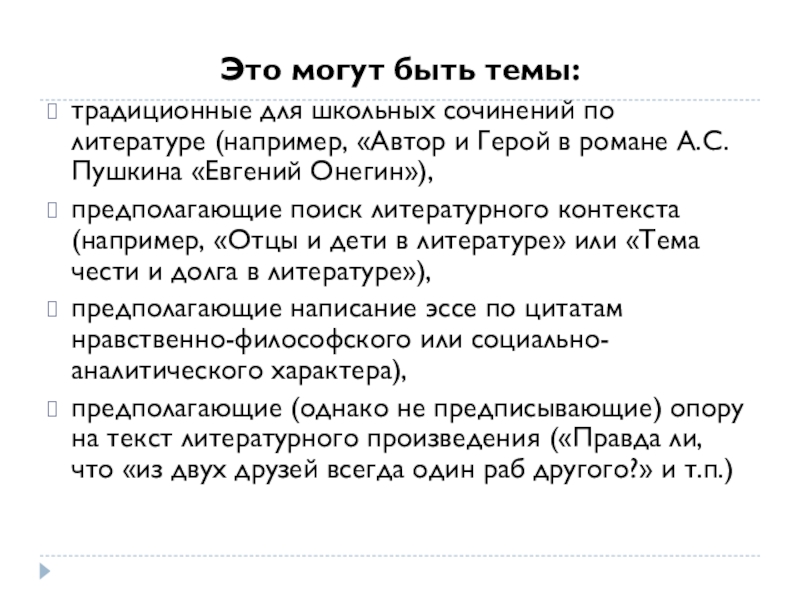 Это могут быть темы:традиционные для школьных сочинений по литературе (например, «Автор и Герой в романе А.С.Пушкина «Евгений