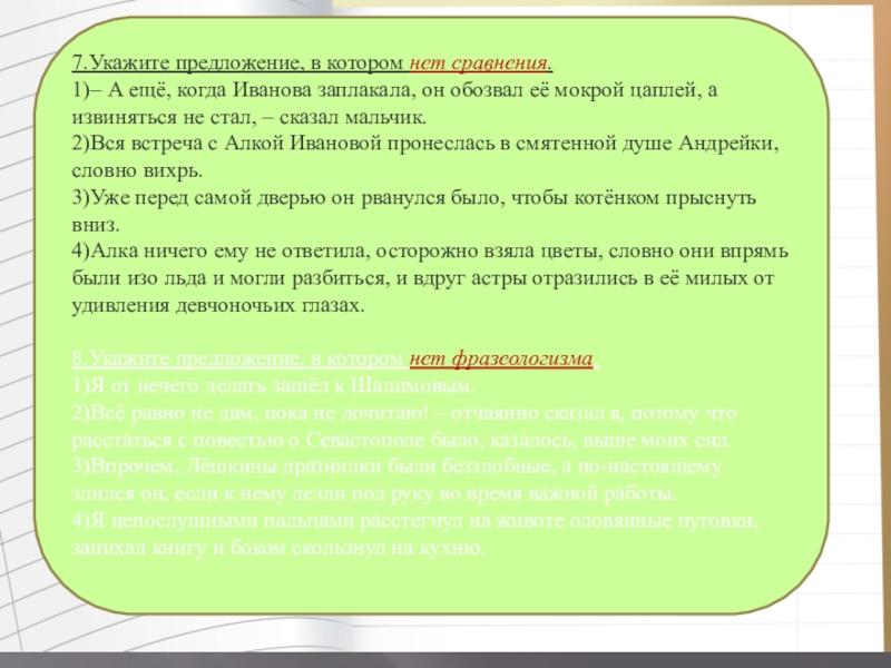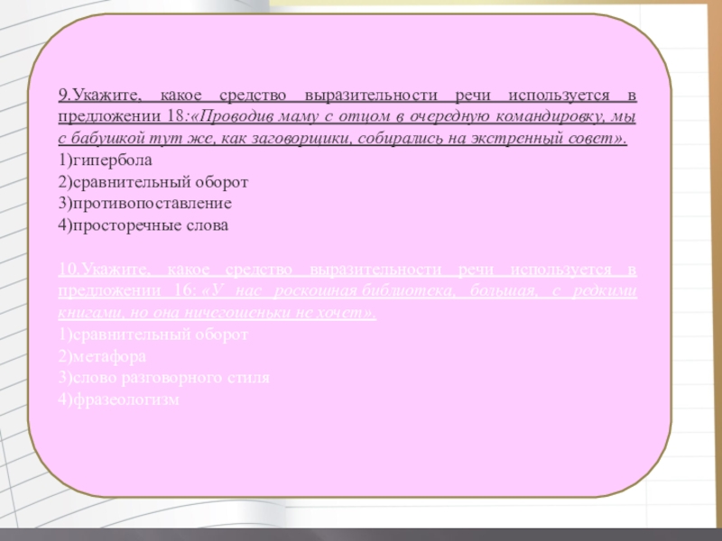 9.Укажите, какое средство выразительности речи используется в предложении 18:«Проводив маму с