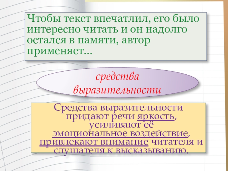 Средства выразительности придают речи яркость, усиливают её эмоциональное воздействие, привлекают внимание читателя и слушателя к высказыванию.