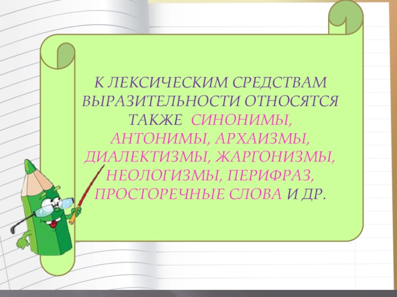 Слайд 7К ЛЕКСИЧЕСКИМ СРЕДСТВАМ ВЫРАЗИТЕЛЬНОСТИ ОТНОСЯТСЯ ТАКЖЕ СИНОНИМЫ, АНТОНИМЫ, АРХАИЗМЫ, ДИАЛЕКТИЗМЫ, ЖАРГОНИЗМЫ,