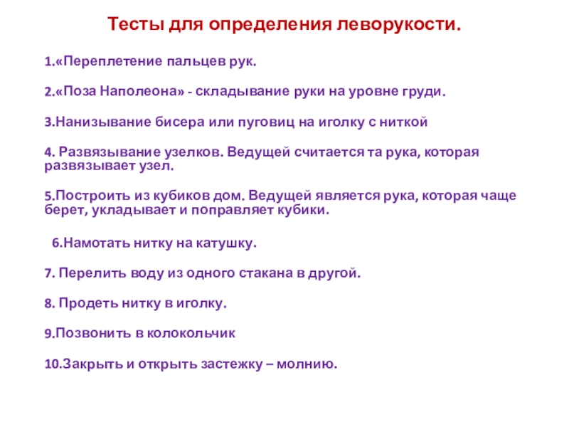 3.Изучить признак леворукости и праворукости, используя определенные тесты – задания;