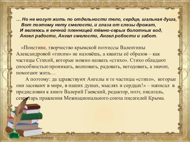 А поэтому: да здравствуют Ангелы и те частицы «стихо», которые они засевают в мире, в наших душах, мыслях и сердцах!» – написал в предисловии к книге Валерий Гаевский, редактор, поэт, писатель, секретарь правления Межнационального союза писателей Крыма.