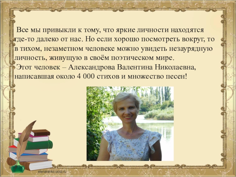 Этот человек – Александрова Валентина Николаевна, написавшая около 4 000 стихов и множество песен!
