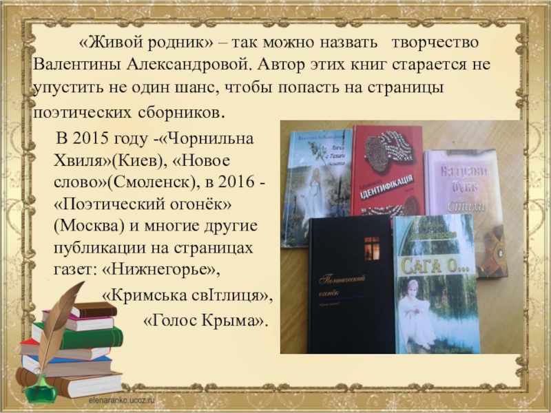 творчество Валентины Александровой. Автор этих книг старается не упустить не один шанс, чтобы попасть на страницы поэтических сборников.