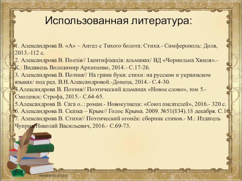 2. Александрова В. Поезія// Iдентифікація: альманах/ ВД «Чорнильна Хвиля».- К.: Видавець Володимир Архипенко, 2014.- С.17-26.