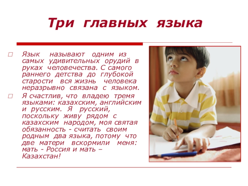 Я счастлив, потому что я владею тремя языками: русским, казахским, английским.