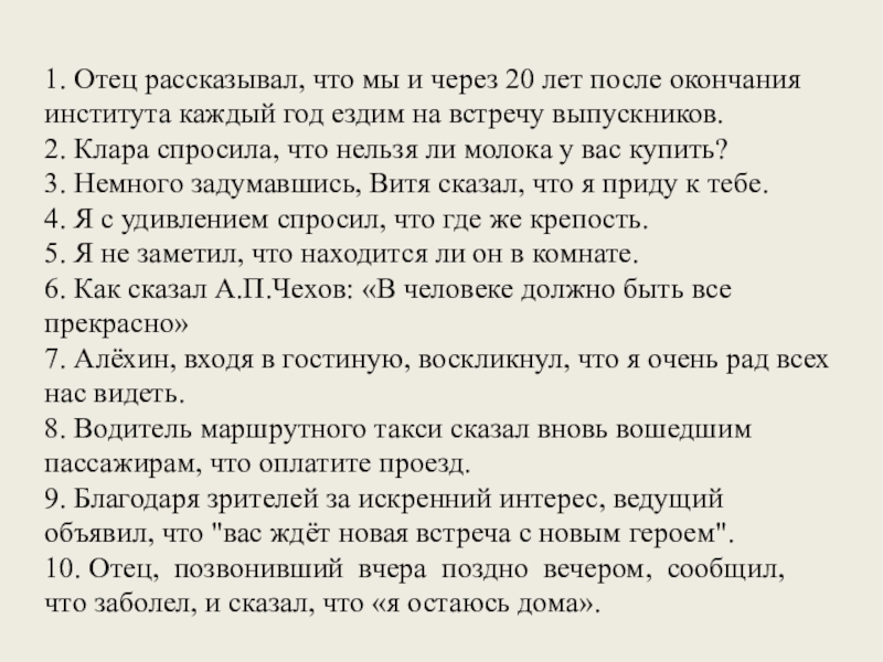 10. Отец, позвонивший вчера поздно вечером, сообщил, что заболел, и сказал, что «я остаюсь дома».