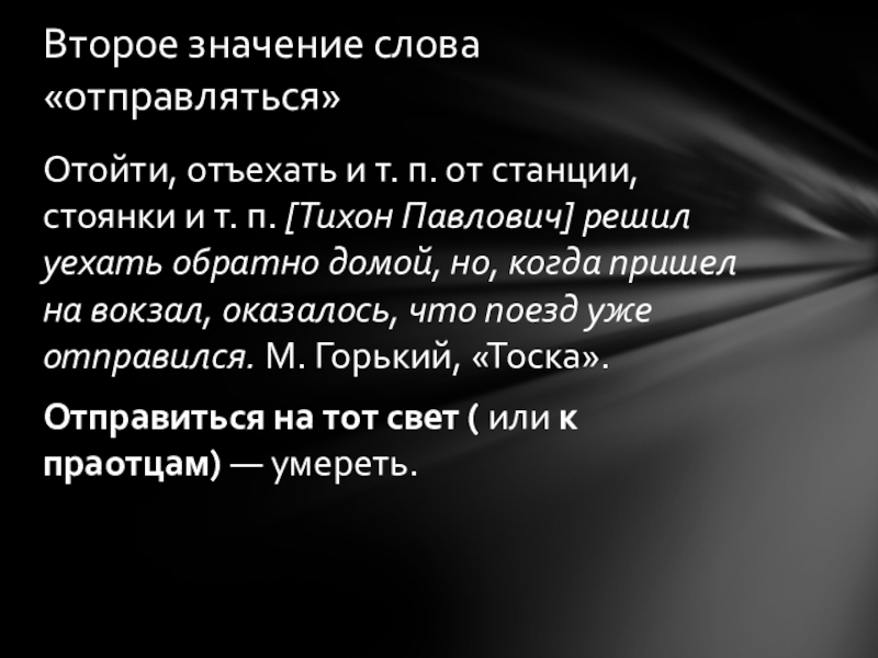 Определите и запишите лексическое значение слова «отправился» из предложения 7. Подберите и запишите предложение, в котором данное многозначное слово употреблялось бы в другом значении.