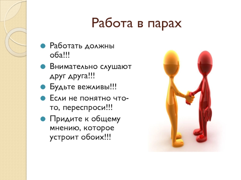 Работа в парахРаботать должны оба!!!Внимательно слушают друг друга!!!Будьте вежливы!!!Если не понятно что-то, переспроси!!!Придите к общему мнению, которое