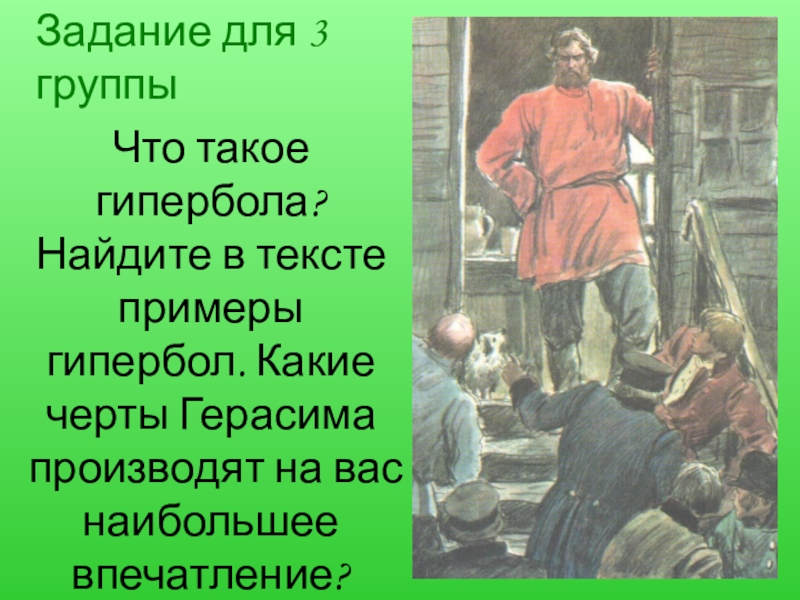Задание для 3 группыЧто такое гипербола? Найдите в тексте примеры гипербол. Какие черты Герасима производят на вас