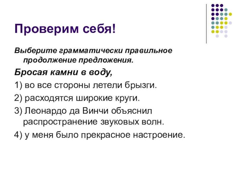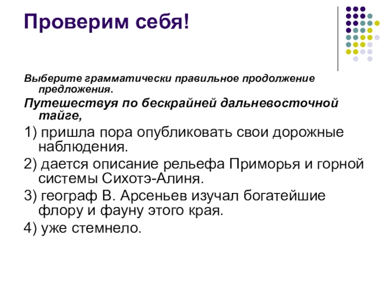 Выберите грамматически правильное продолжение предложения
