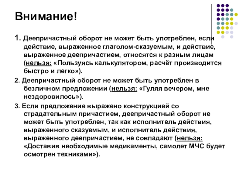 2. Деепричастный оборот не может быть употреблен в безличном предложении (нельзя: «Гуляя вечером, мне нездоровилось»).