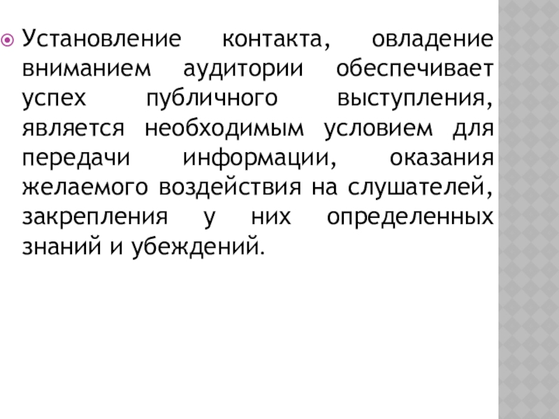 Установление контакта, овладение вниманием аудитории обеспечивает успех публичного выступления, является необходимым условием для передачи информации, оказания желаемого