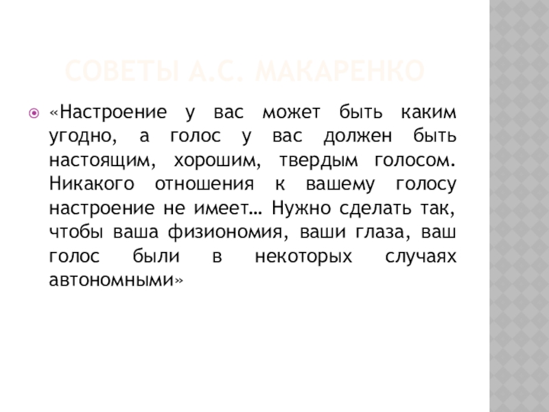 Советы А.С. Макаренко«Настроение у вас может быть каким угодно, а голос у вас должен быть настоящим, хорошим,