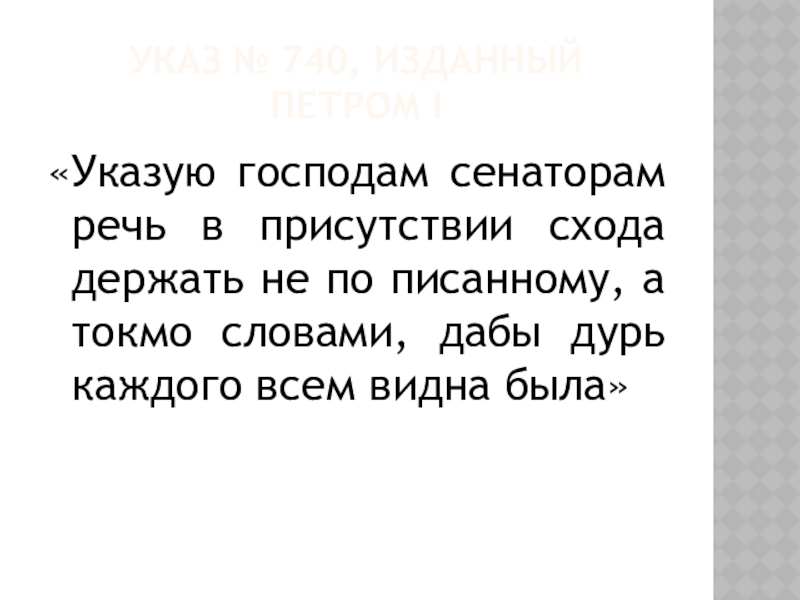 Указ № 740, изданный  Петром i«Указую господам сенаторам речь в присутствии схода держать не по писанному,