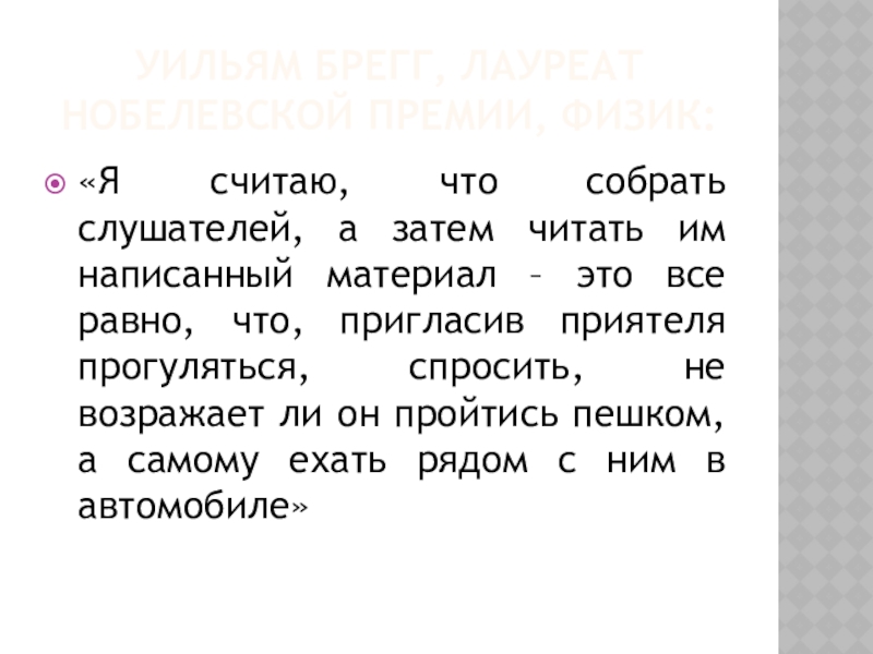 Уильям Брегг, лауреат нобелевской премии, физик:«Я считаю, что собрать слушателей, а затем читать им написанный материал –