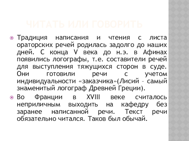Читать или говоритьТрадиция написания и чтения с листа ораторских речей родилась задолго до наших дней. С конца