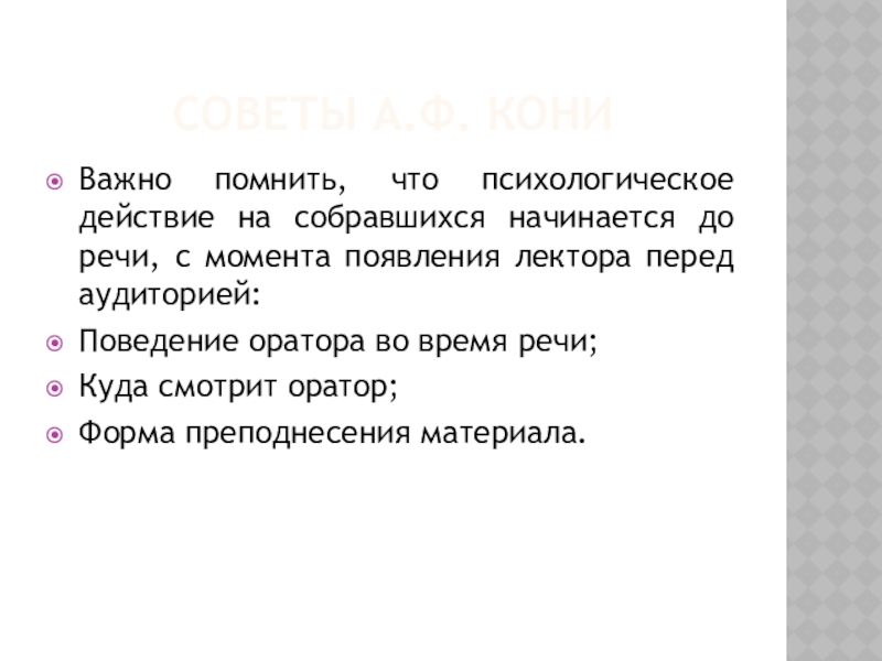 Советы А.Ф. КониВажно помнить, что психологическое действие на собравшихся начинается до речи, с момента появления лектора перед