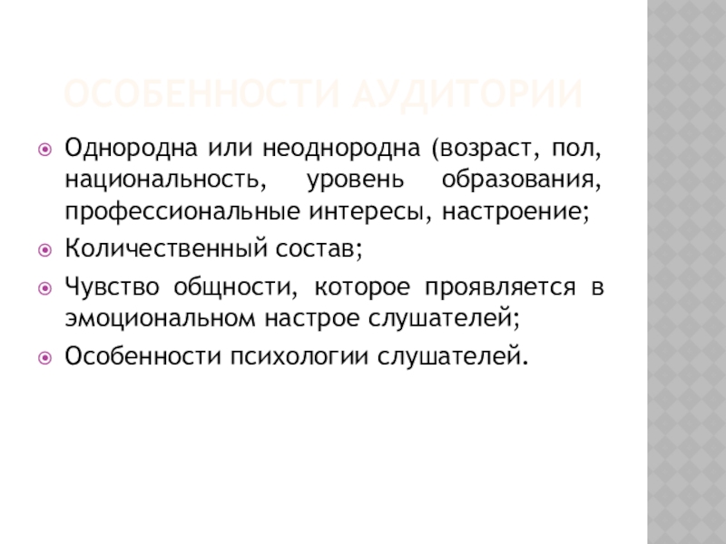 Особенности аудиторииОднородна или неоднородна (возраст, пол, национальность, уровень образования, профессиональные интересы, настроение;Количественный состав;Чувство общности, которое проявляется в