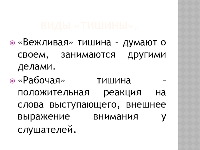 Виды «тишины».«Вежливая» тишина – думают о своем, занимаются другими делами.«Рабочая» тишина – положительная реакция на слова выступающего,