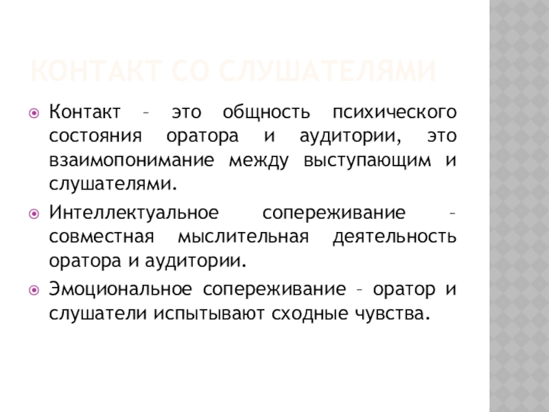 Контакт со слушателямиКонтакт – это общность психического состояния оратора и аудитории, это взаимопонимание между выступающим и слушателями.Интеллектуальное сопереживание – совместная мыслительная деятельность оратора и аудитории.Эмоциональное сопереживание – оратор и слушатели испытывают сходные чувства.