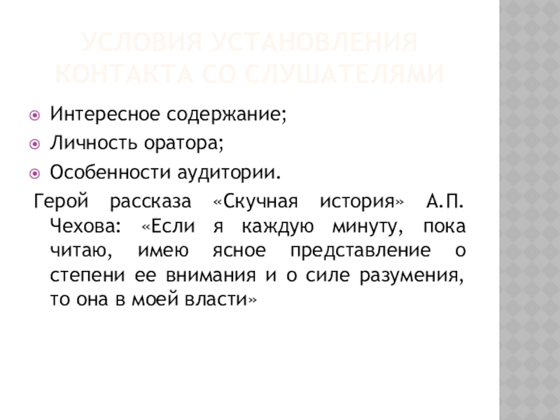 Условия установления контакта со слушателямиИнтересное содержание;Личность оратора;Особенности аудитории.Герой рассказа «Скучная история» А.П.Чехова: «Если я каждую минуту, пока