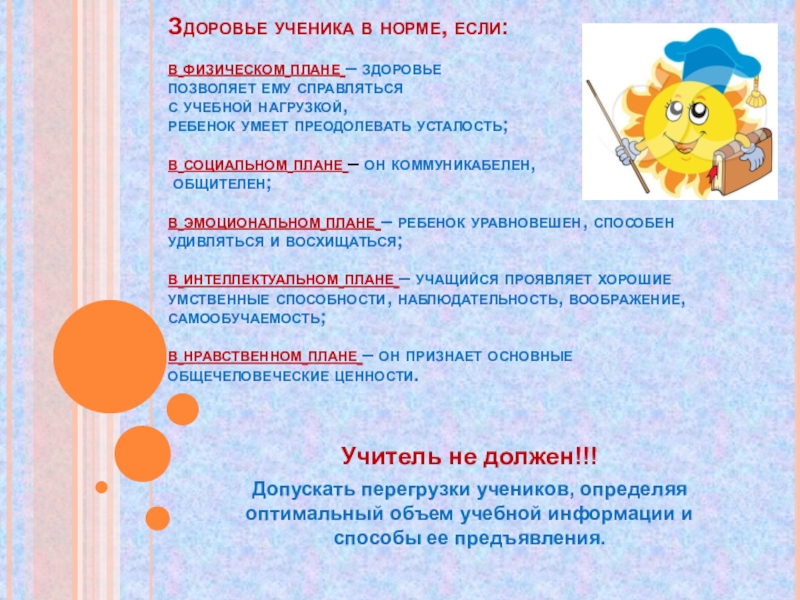 Допускать перегрузки учеников, определяя оптимальный объем учебной информации и способы ее предъявления.