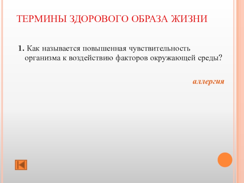 ТЕРМИНЫ ЗДОРОВОГО ОБРАЗА ЖИЗНИ 1. Как называется повышенная чувствительность организма к воздействию факторов окружающей среды?  аллергия