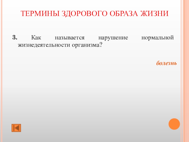ТЕРМИНЫ ЗДОРОВОГО ОБРАЗА ЖИЗНИ 3. Как называется нарушение нормальной жизнедеятельности организма? болезнь