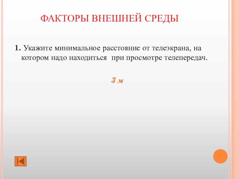 ФАКТОРЫ ВНЕШНЕЙ СРЕДЫ 1. Укажите минимальное расстояние от телеэкрана, на котором надо находиться при просмотре телепередач. 3