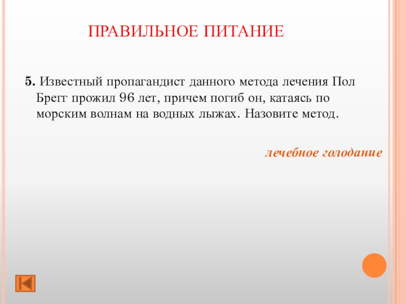 ПРАВИЛЬНОЕ ПИТАНИЕ 5. Известный пропагандист данного метода лечения Пол Брегг прожил 96 лет, причем погиб он, катаясь