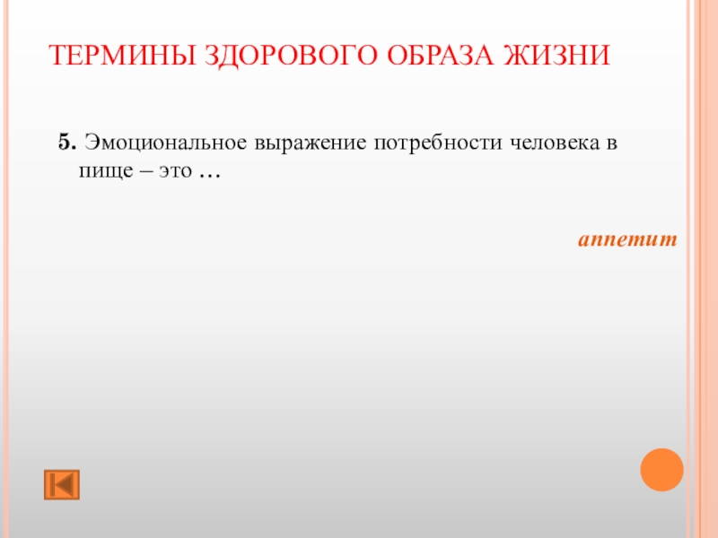ТЕРМИНЫ ЗДОРОВОГО ОБРАЗА ЖИЗНИ 5. Эмоциональное выражение потребности человека в пище – это … аппетит