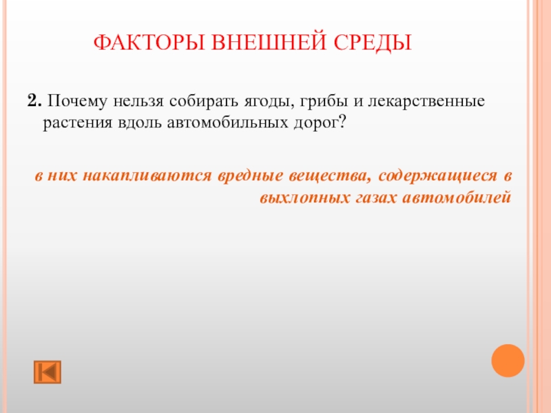ФАКТОРЫ ВНЕШНЕЙ СРЕДЫ 2. Почему нельзя собирать ягоды, грибы и лекарственные растения вдоль автомобильных дорог? в них