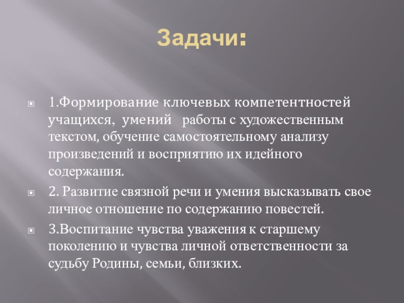 Задачи:1.Формирование ключевых компетентностей учащихся, умений работы с художественным текстом, обучение самостоятельному анализу произведений и восприятию их идейного содержания.2. Развитие связной речи и умения высказывать свое личное отношение по содержанию повестей. 3.Воспитание чувства уважения к