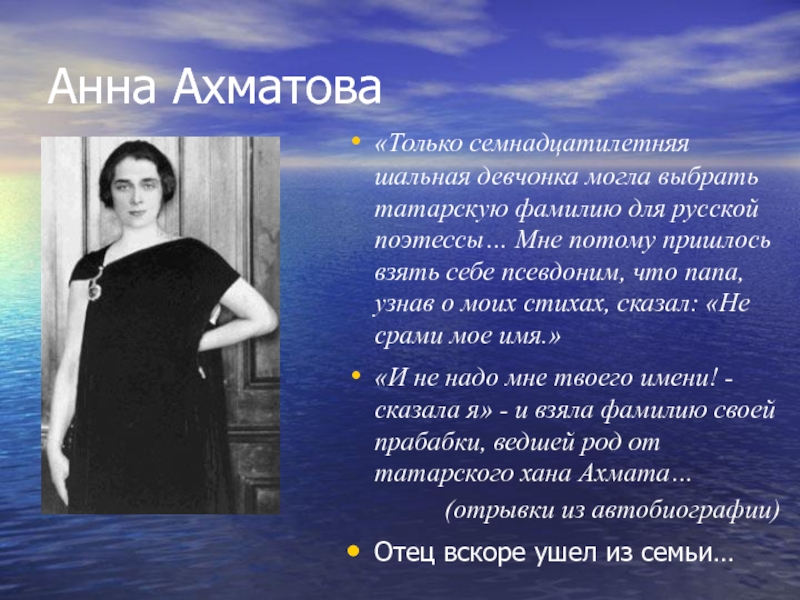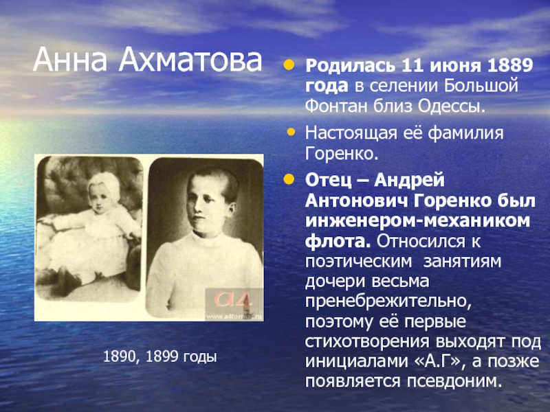 Отец – Андрей Антонович Горенко был инженером-механиком флота. Относился к поэтическим занятиям дочери весьма пренебрежительно, поэтому её первые стихотворения выходят под инициалами «А.Г», а позже появляется псевдоним.