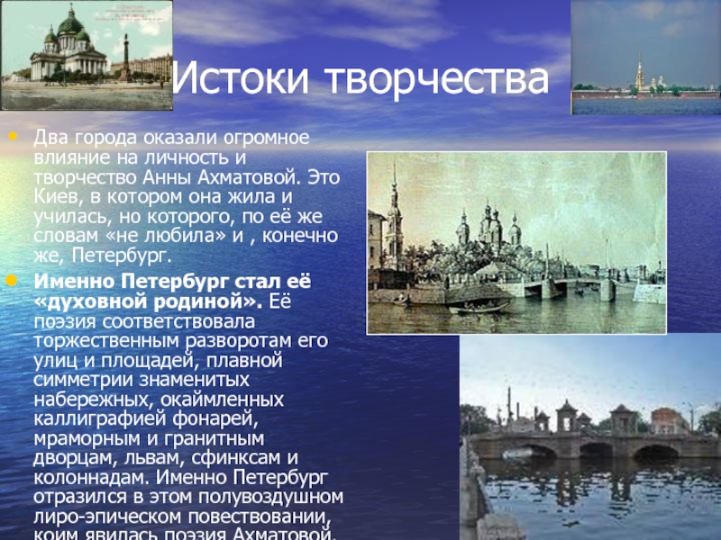 Именно Петербург стал её «духовной родиной». Её поэзия соответствовала торжественным разворотам его улиц и площадей, плавной симметрии знаменитых набережных, окаймленных каллиграфией фонарей, мраморным и гранитным дворцам, львам, сфинксам и колоннадам. Именно Петербург отразился в этом полувоздушном лиро-эпическом повествовании, коим явилась поэзия Ахматовой.