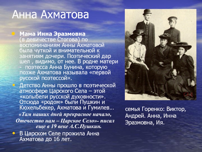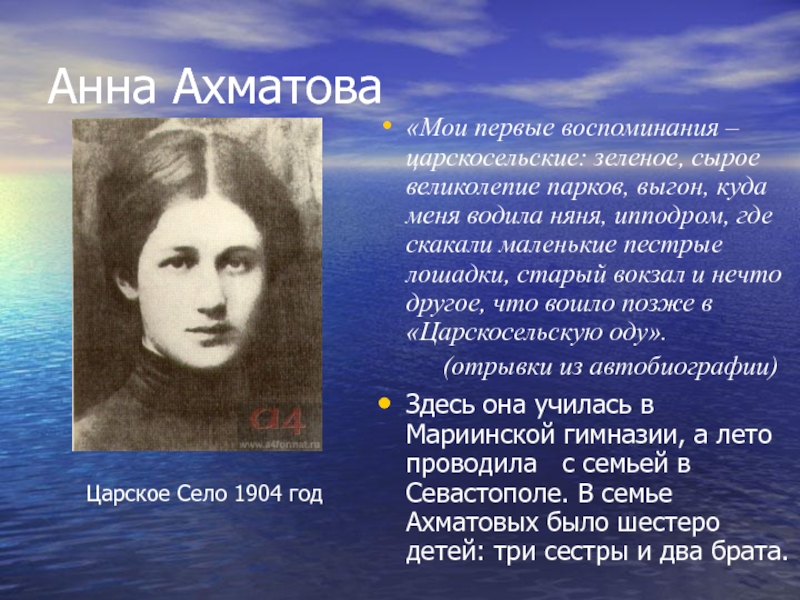Здесь она училась в Мариинской гимназии, а лето проводила с семьей в Севастополе. В семье Ахматовых было шестеро детей: три сестры и два брата.