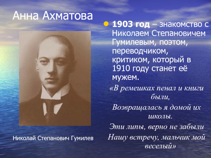 1903 год – знакомство с Николаем Степановичем Гумилевым, поэтом, переводчиком,