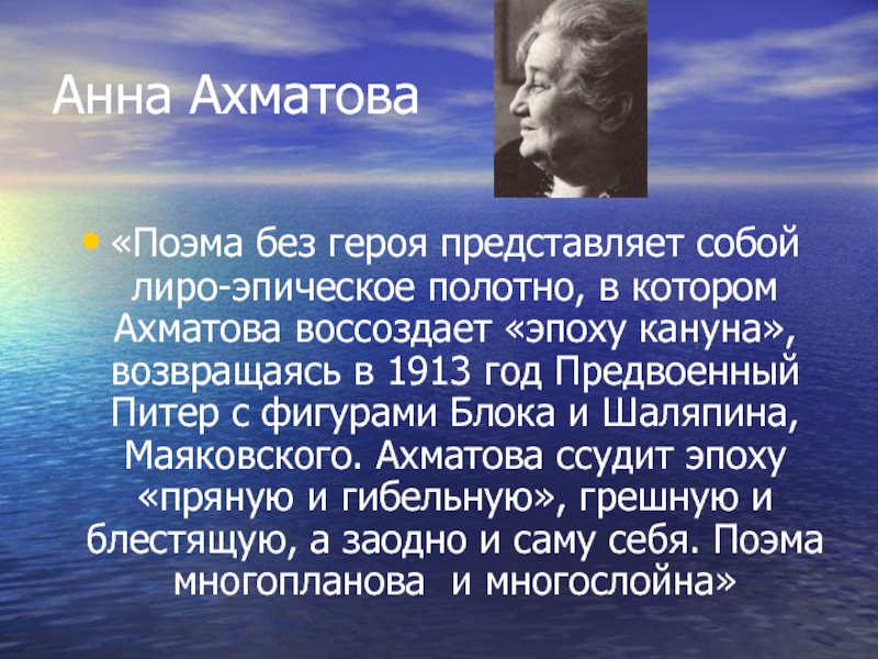 воссоздает «эпоху кануна», возвращаясь в 1913 год Предвоенный Питер с фигурами Блока и Шаляпина, Маяковского. Ахматова ссудит эпоху «пряную и гибельную», грешную и блестящую, а заодно и саму себя. Поэма многопланова и многослойна»