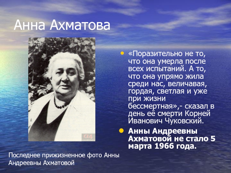 то, что она упрямо жила среди нас, величавая, гордая, светлая и уже при жизни бессмертная»,- сказал в день её смерти Корней Иванович Чуковский.